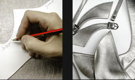 Jugar con las líneas, los escotes, la  sensualidad, esbozar cada modelo, contemplarlo en sus materiales, levantarlo  con los tacos, hacer el intento... diseñar los zapatos desde la horma corazón y  ajustarlo con los finos trazos de una mano. Depurar cada modelo al extremo,  interpretarlos y darles vida.